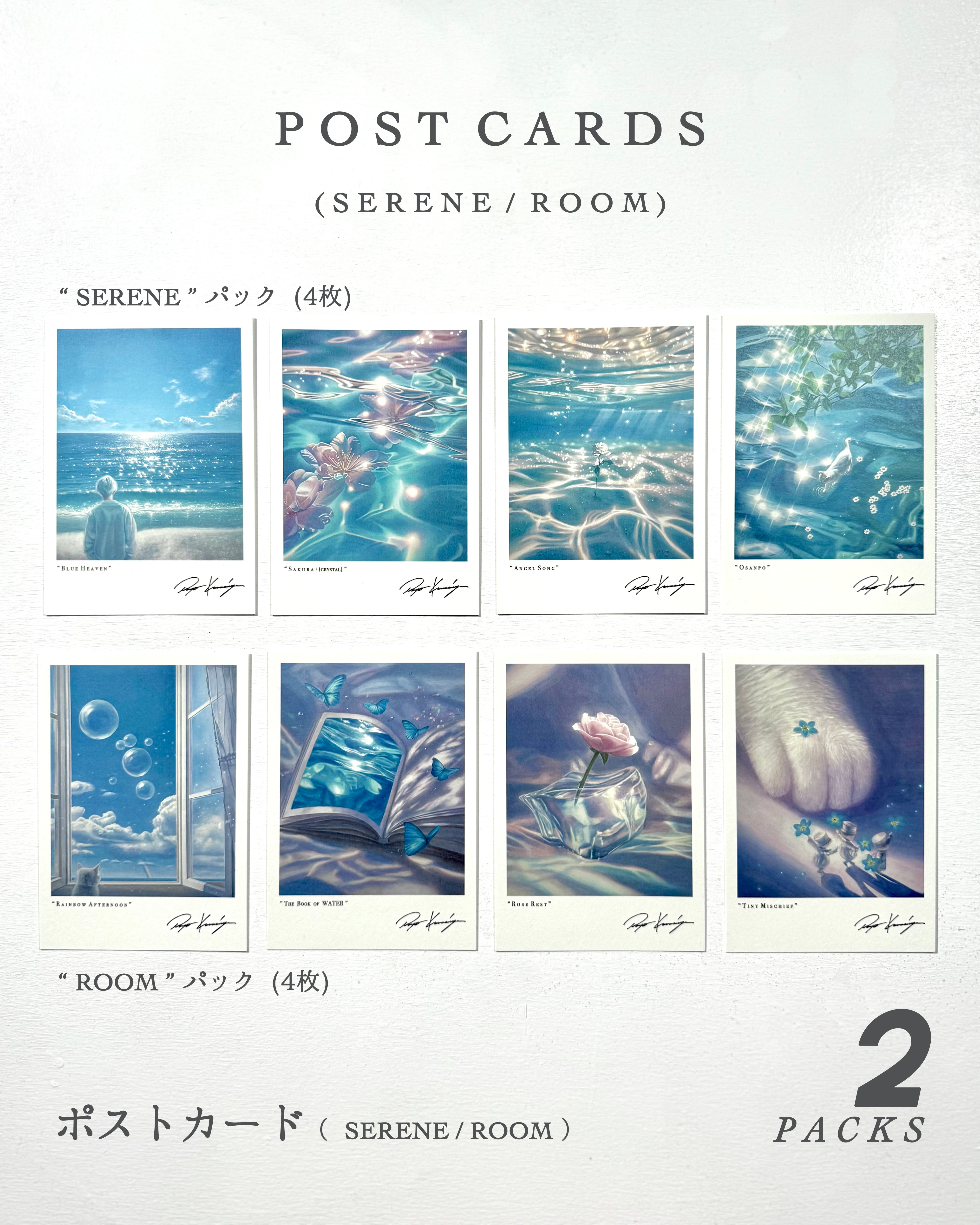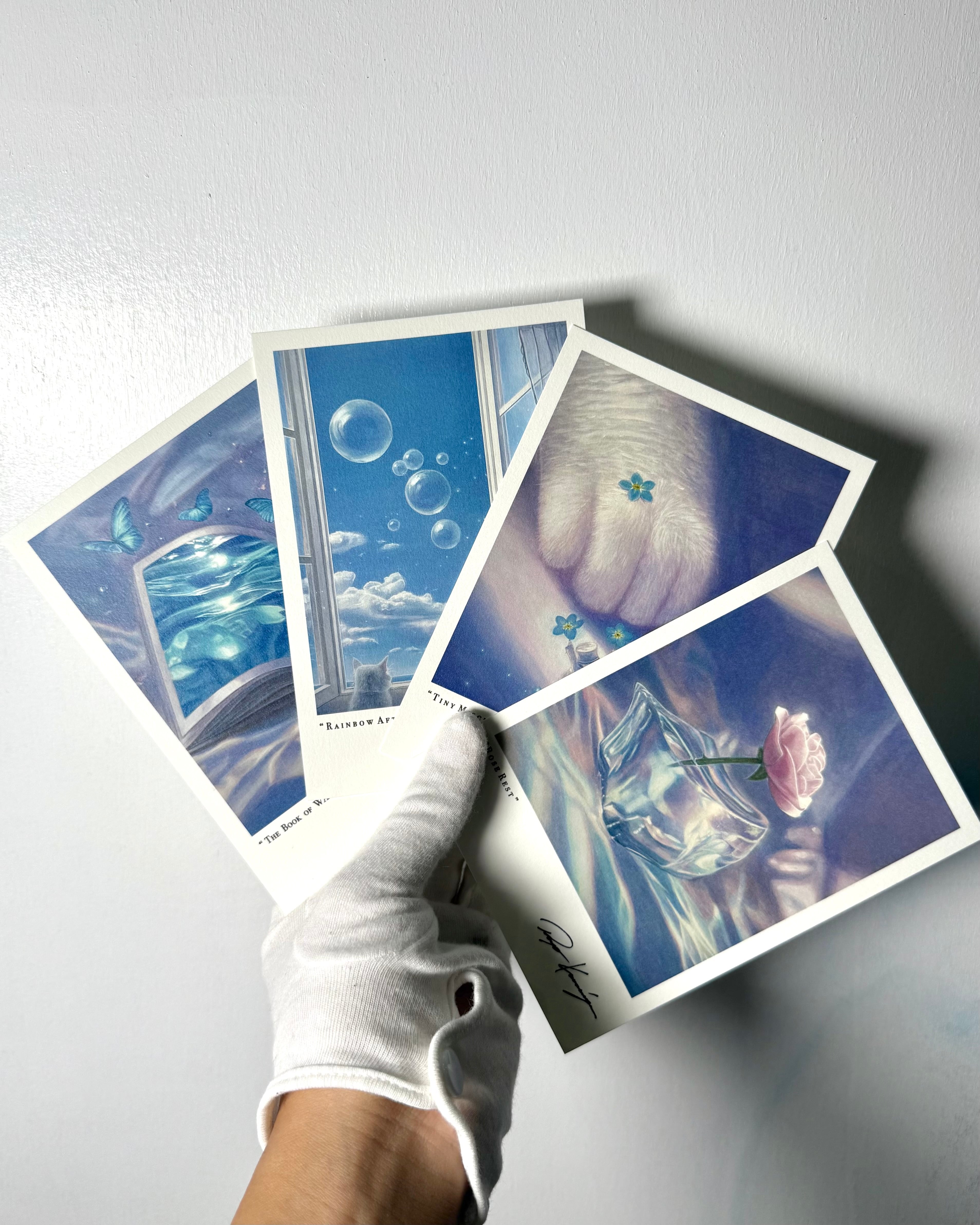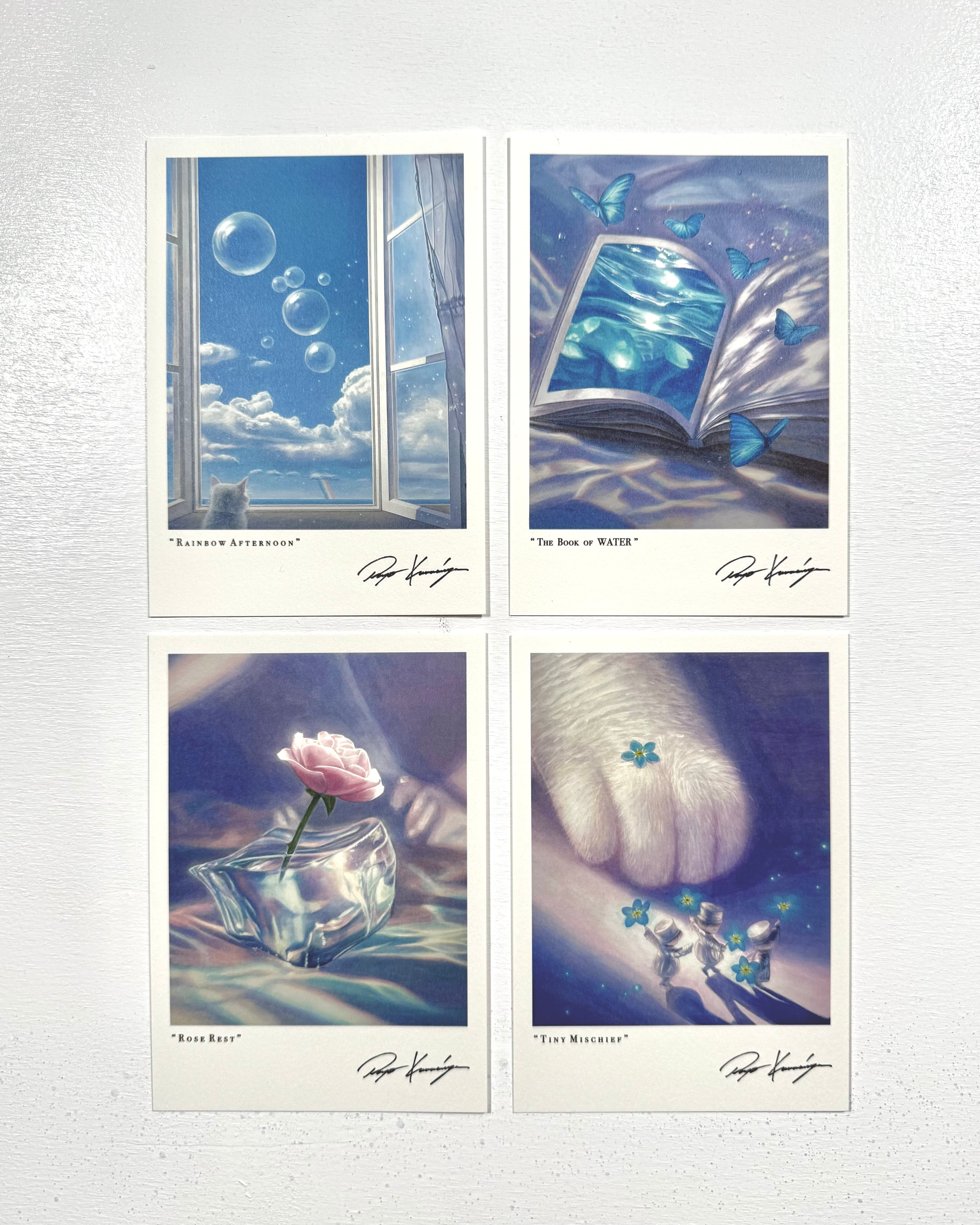 WATERシリーズから、お花がモチーフの作品4枚をポストカードとしてパッケージしました。そのまま飾るのはもちろん、厚みと固さがあるので栞としても日常使いできます。