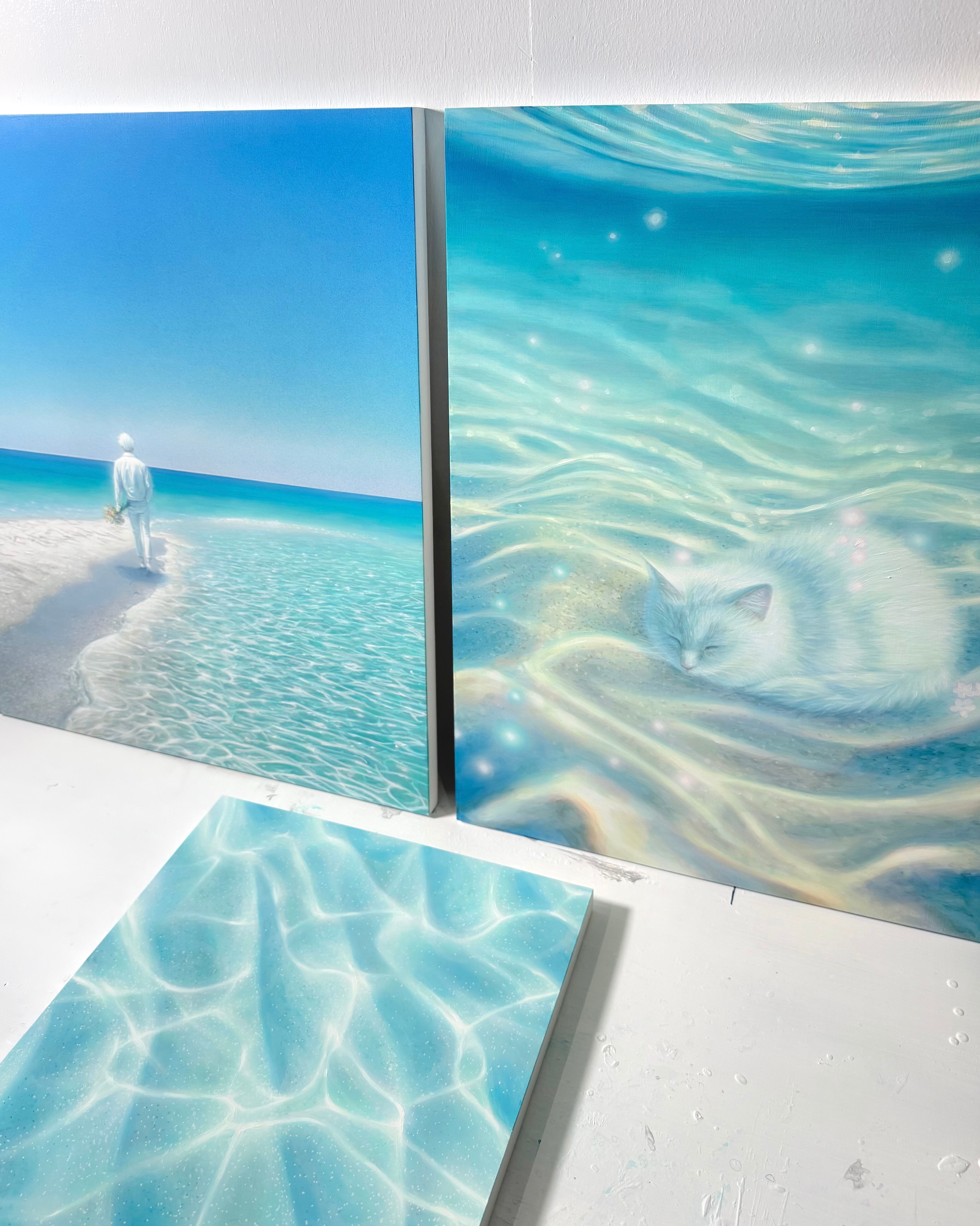 夢の中の浅瀬で足元の光が揺れている、というシンプルな一場面を絵にしました。