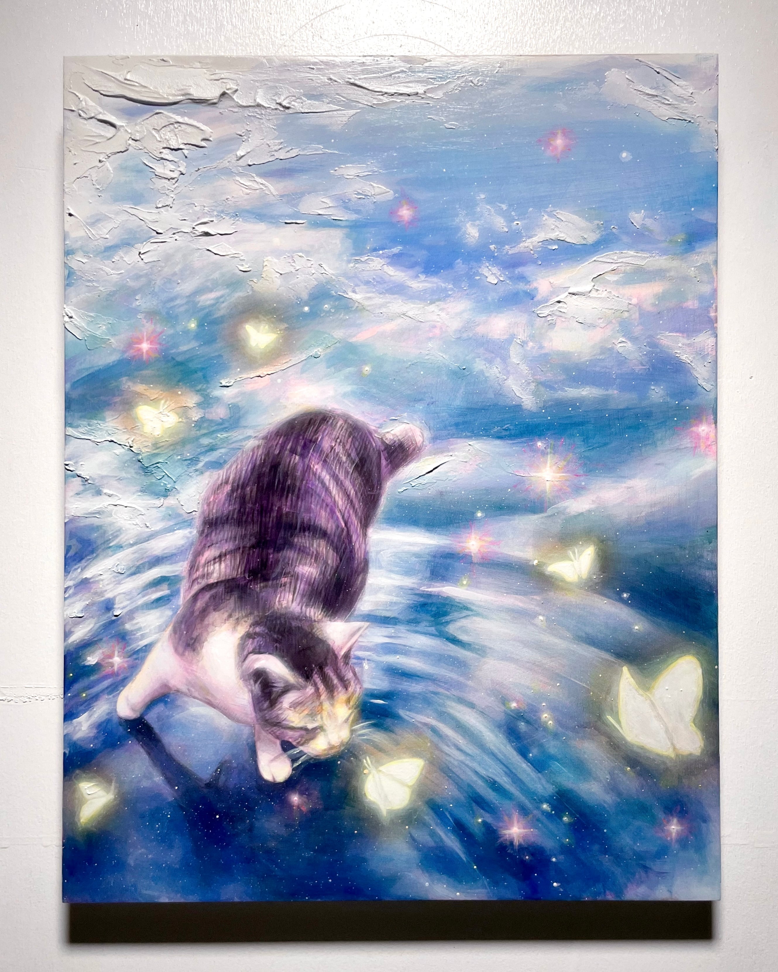 命がこの世を離れて天国に行く道中を描いた作品です。光る蝶は天国までの案内人で、この世のものではないため水面に映る影をあえて描きませんでした。水面の上に空が反射している描写も、普段見える景色が反転しているという点で死というテーマを暗示しています。